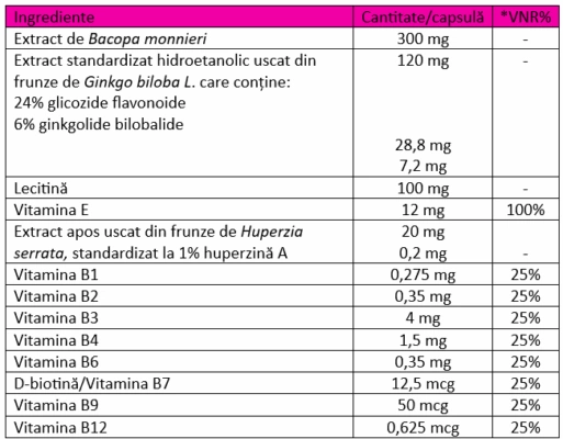 Formula sustine performanta cognitiva, atentia, memoria si concentrarea, avand si actiune asupra rezistentei sistemului nervos la stres oxidativ (care duce la deteriorarea prematura a celulelor) si la efort intelectual prelungit.