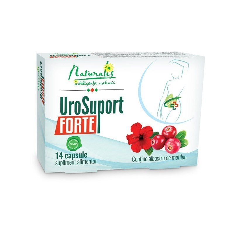 UroSuport FORTE, capsule, contine extracte de Afin american/Merisor canadian (Vaccinium macrocarpon) si de Hibiscus (Hibiscus sabdariffa), in combinatie cu albastru de metilen si D-manoza.